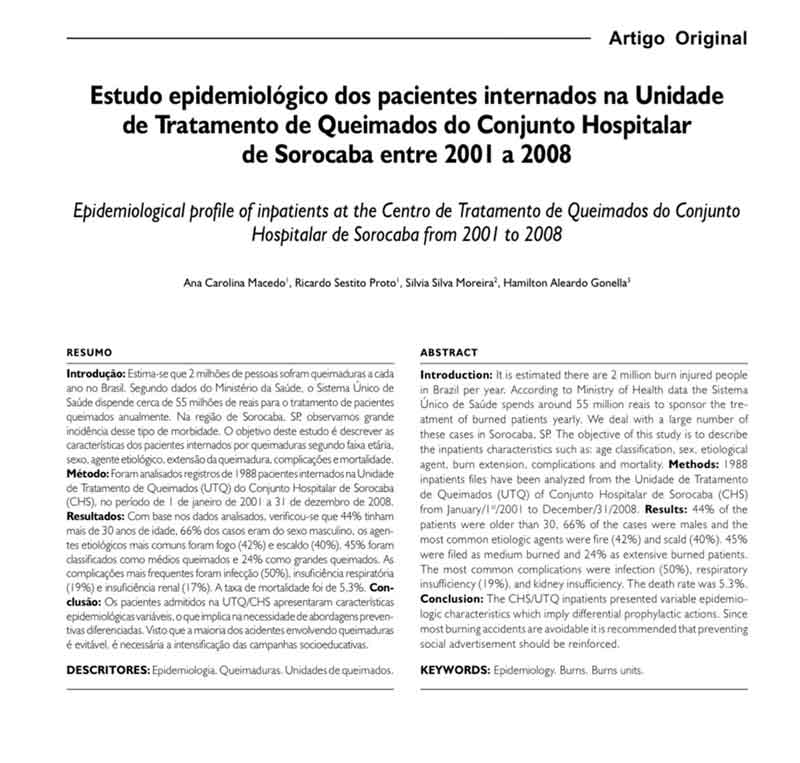 It is estimated there are 2 million burn injured people in Brazil per year. According to Ministry of Health data the Sistema Único de Saúde spends around 55 million reais to sponsor the treatment of burned patients yearly. We deal with a large number of these cases in Sorocaba, SP.